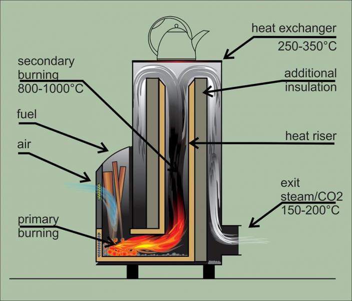 Накратко това е печка състояща се от горивна камера, където цепениците горят в долния си край, а пламъците и димните газове се отвеждат първоначално в хоризонтална посока в (хипер-)термоизолиран проход с L-форма или J-форма в зависимост от конструкцията.