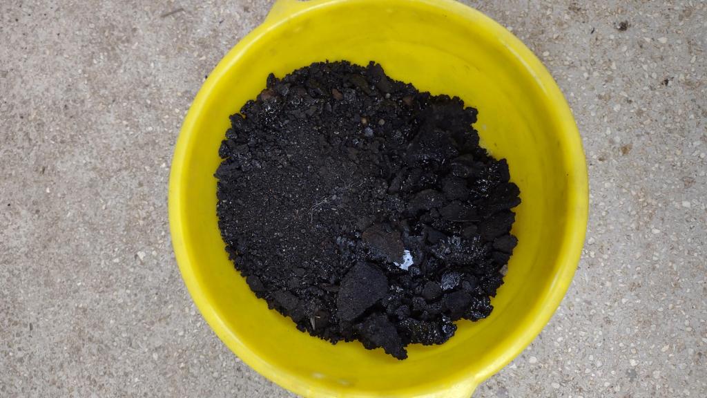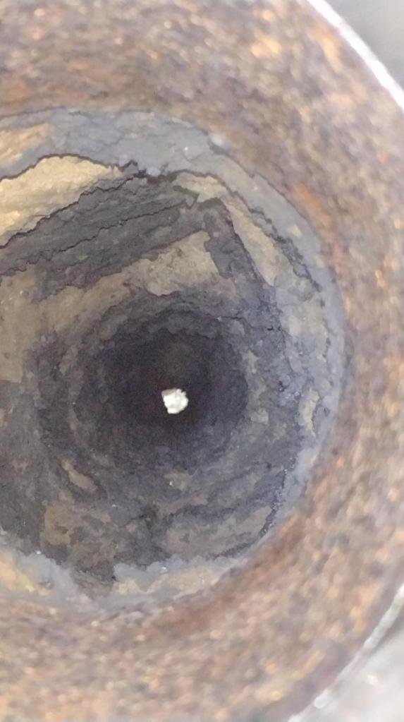 Последните снимки показват просвета на комина, където Коминче е включена. Очевидно няма нужда от почистване. Вдясно виждате общото количество сажди и креозот, извадени от ревизионния отвор на същия. Формират се големи късове креозот, които вместо да се отлагат по стените на коминната тръба се свличат директно към пепелника. Разбира се има и по-малки парчета. Половин леген креозотни остатъци е приемлива цена за сезон работа. Комина е вътрешен и не е термоизолиран към тавана или над керемидите.