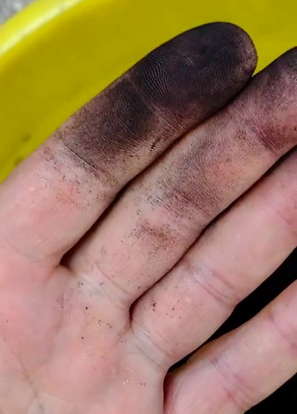 Горе вляво виждате отлагането на сажди в хоризонталната част на кюнеца на печка тип камина, а вдясно при Коминче в рамките на един отоплителен сезон. Камината е ползвана рядко, предимно с естетическа цел, но въпреки това е натрупала сериозно количество сажди, докато Коминче е ползвана по 8, 12, че и по 18 часа в денонощието с изключение на месец май 2023г. На снимките долу може да сравните саждите от двата типа печка – при камината (ляво) те са мазни, докато при Коминче са сухи, стъкловидни и не оставят сериозни следи при разтъркване между пръстите.