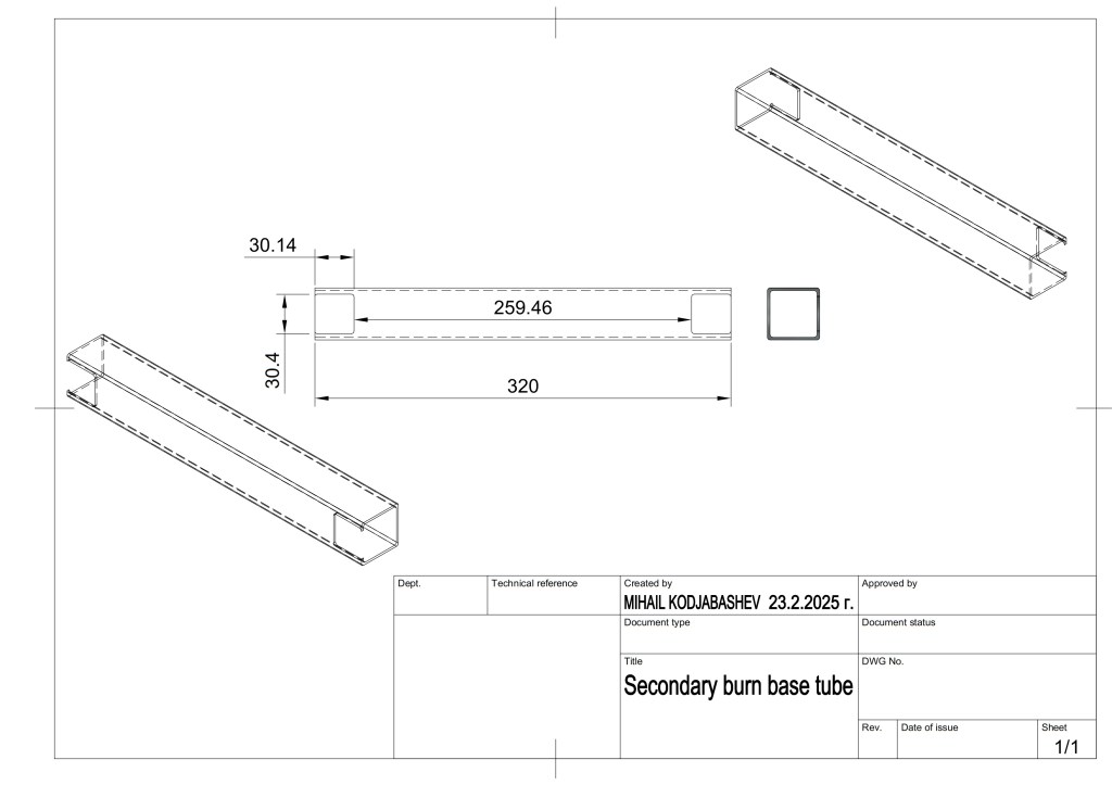 За да бъдем обективни ефективността на тази скара спада ако в печката дървата тлеят или сложите ново парче върху жарта. В момента обмислям как да повдигам плочата върху скарата на дъното в случай на нужда от бързо доразпалване на огъня. По-долу снимки на добавката и връзка с клипчета в ютюб канала ми. Прилагам и планове на елементите с размери за желаещите да възпроизведат скарата. Използват се квадратни профили както следва: 30х30мм – 2броя по 170мм, основа – 40х40мм – 320мм, тръба ф20 със стена 2мм – 3 броя по 260мм всеки. Отзад малко парче 40х40мм за клапа, ако майстора има желание, но може и да си седи отворено. Важно е да се уплътни отвора, за да се попречи на въздуха да заобикаля системата от тръби.